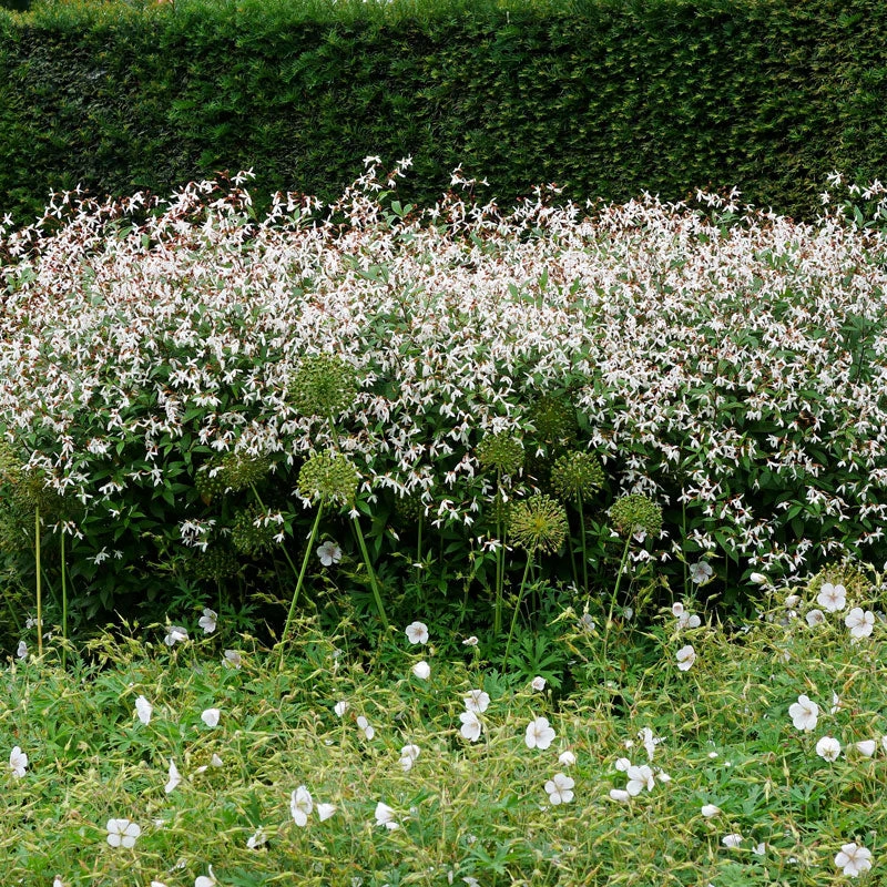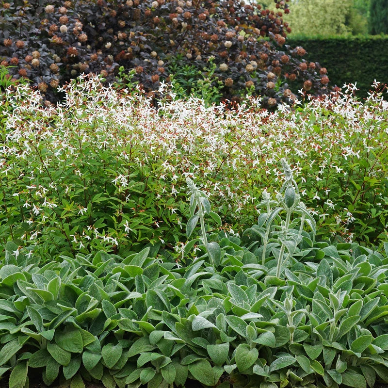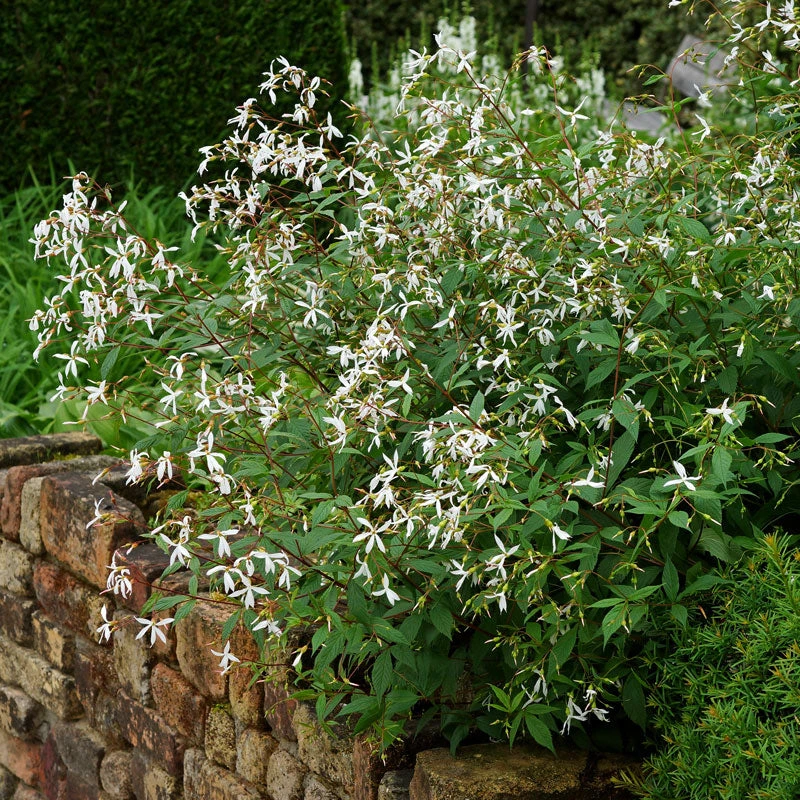 - Dainty star-shaped blooms pair with red stems.